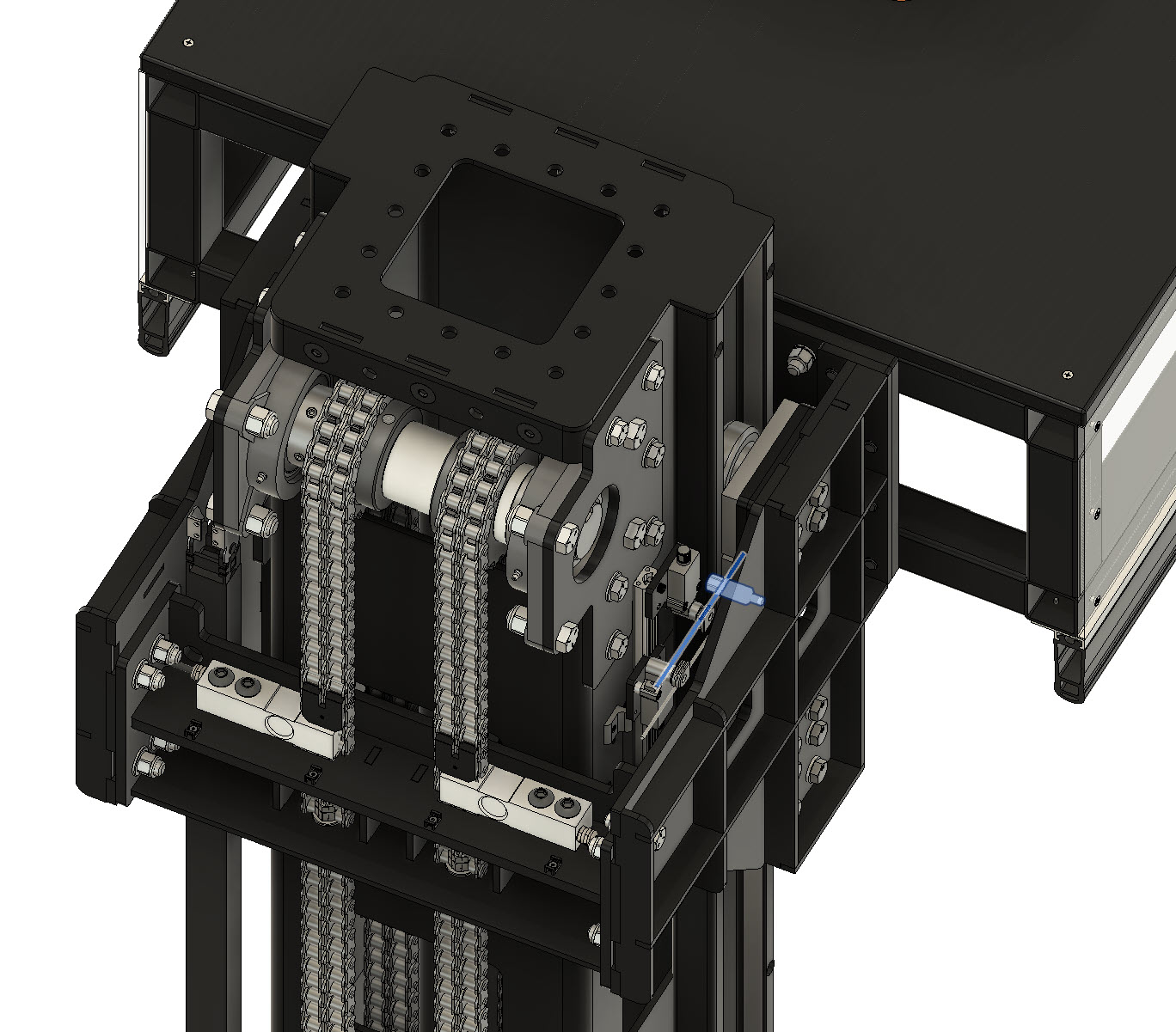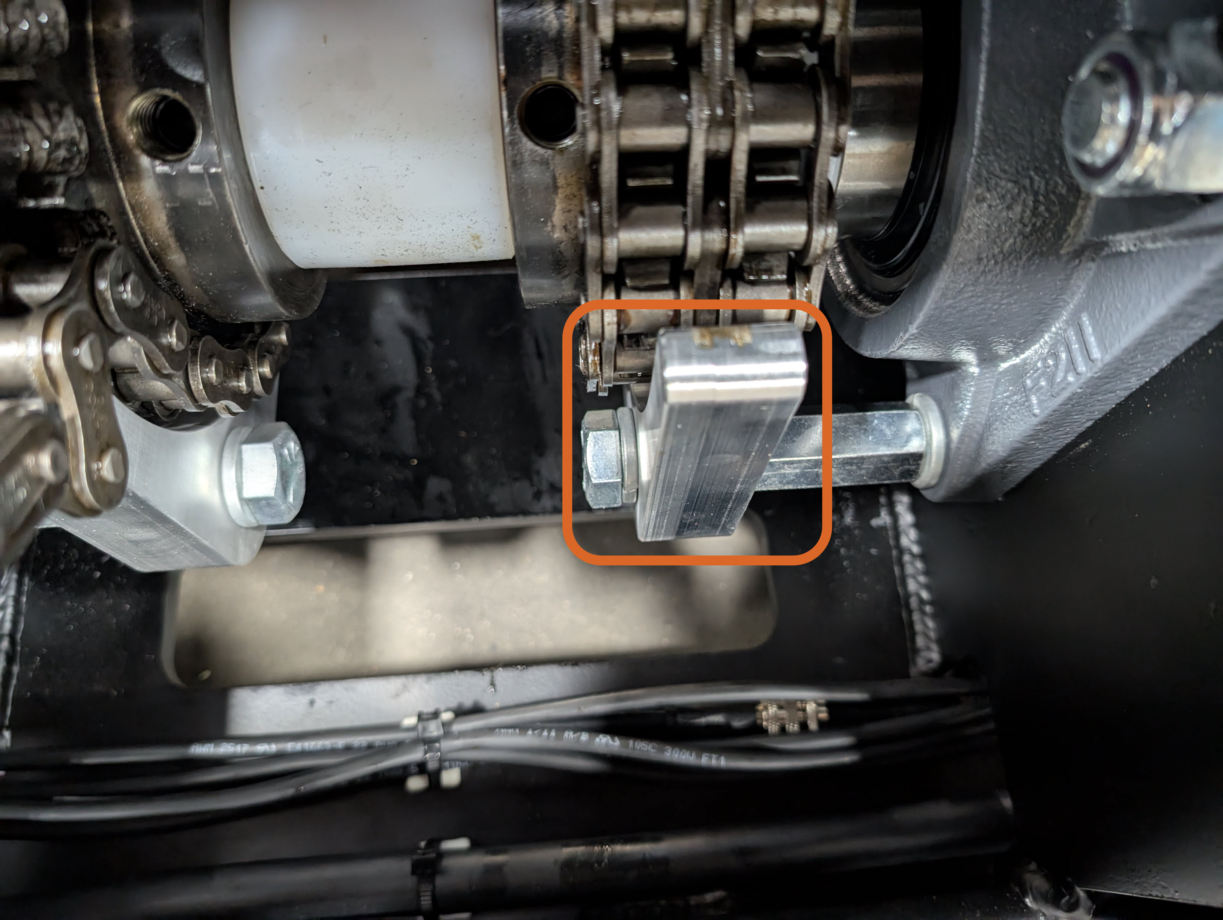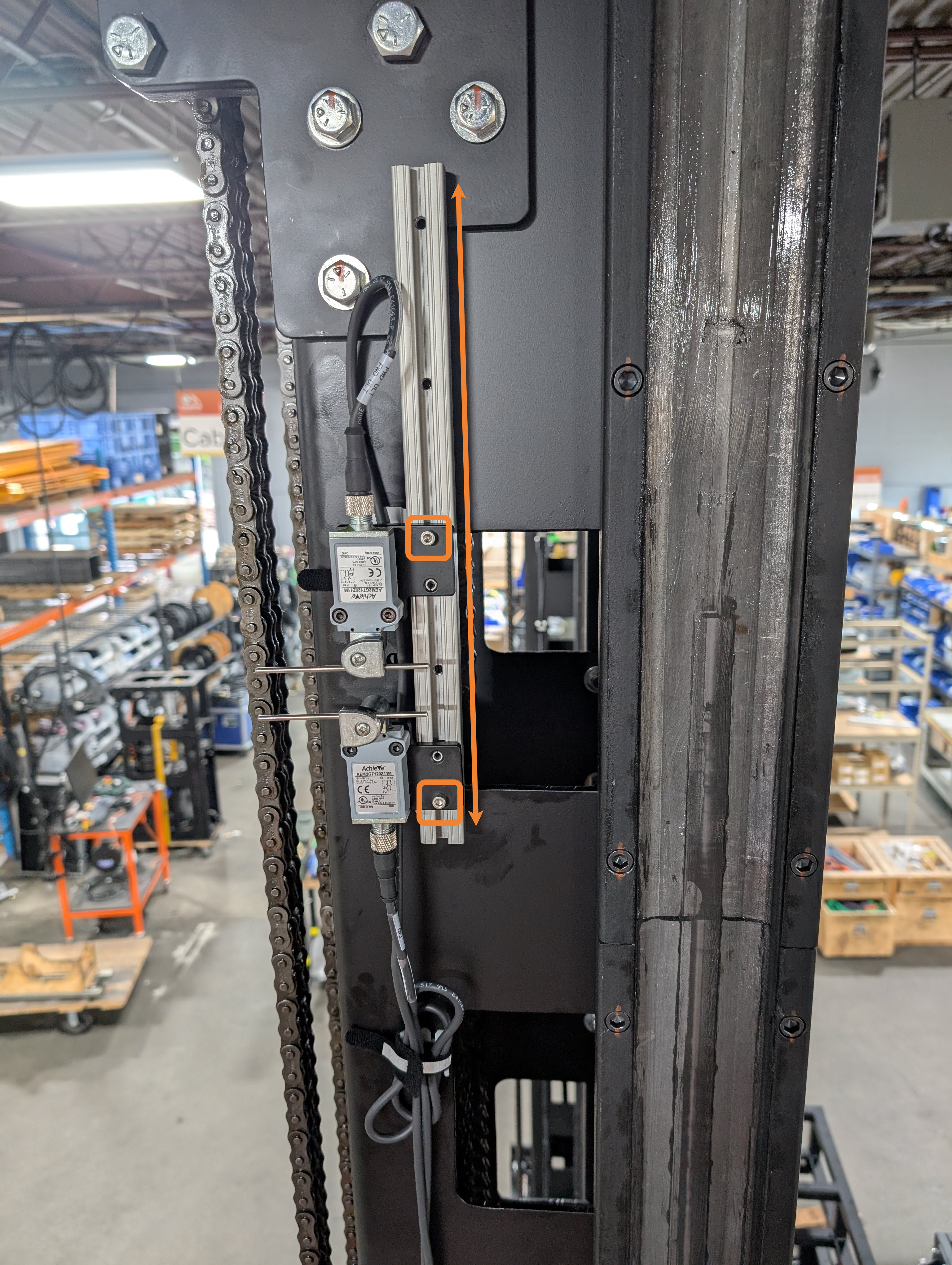 Important Note: The Chain Tension will determine how much additional load is being applied to the motor and affect the amount of load the load cell is reading. It is reccomended that you run the platform all the way up, and then adjust the chain tension so that the chain is loose. About 3-4" of deflection measured from the center of the mast is about right, but you may need to adjust slightly to get accurate load readings.