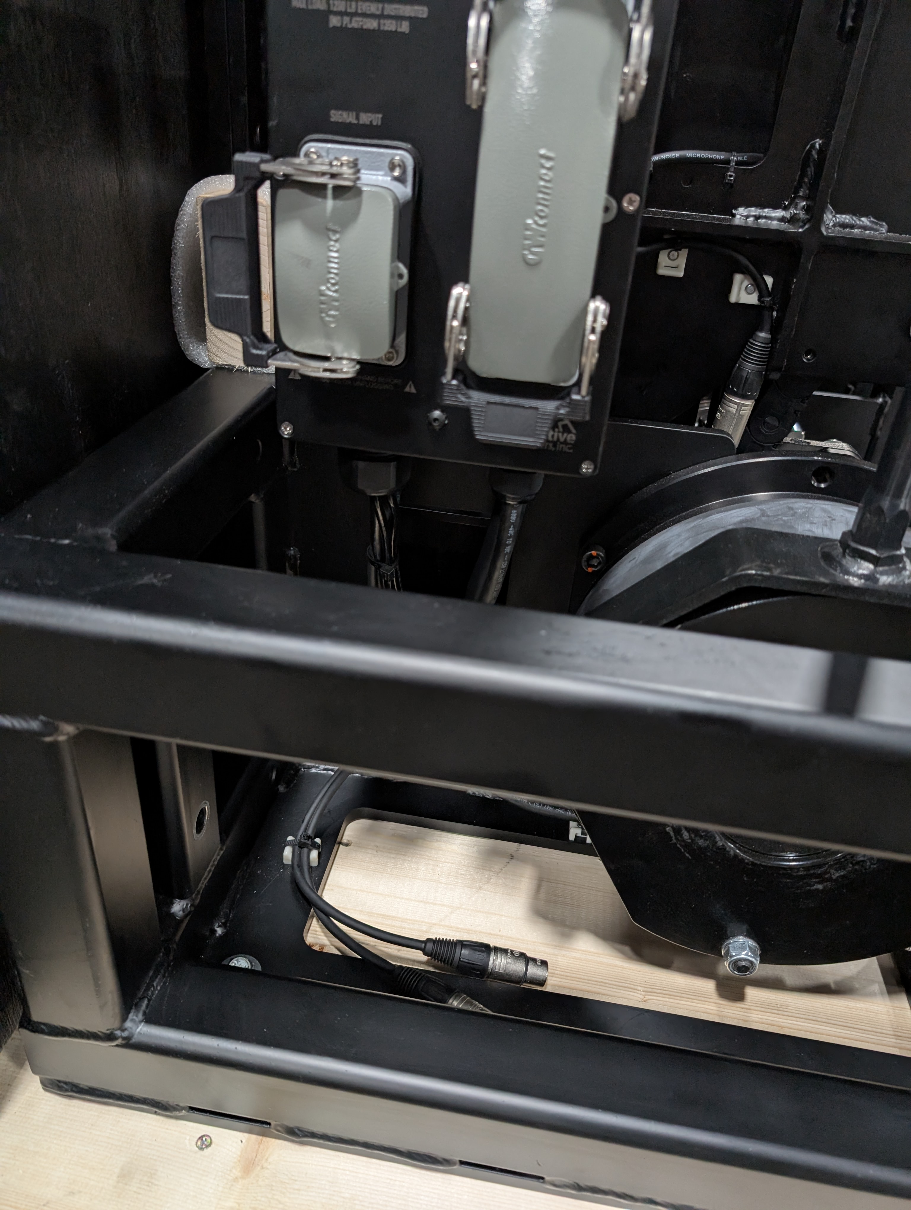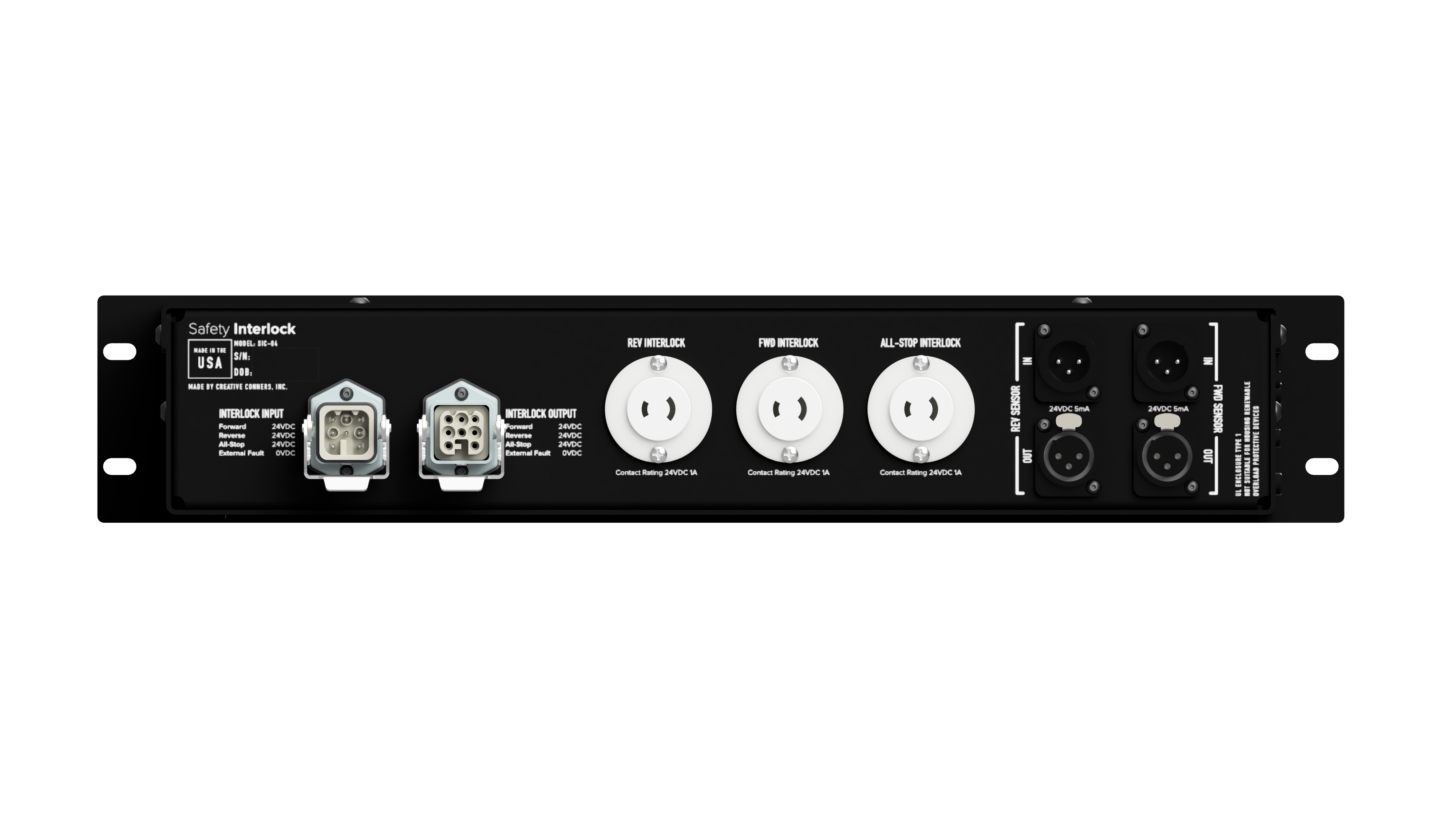 Connect the 3 pin XLR Safety Interlock cables from floorpocket bumper switches to REV Sensor In and Out on the Safety Interlock Box.
