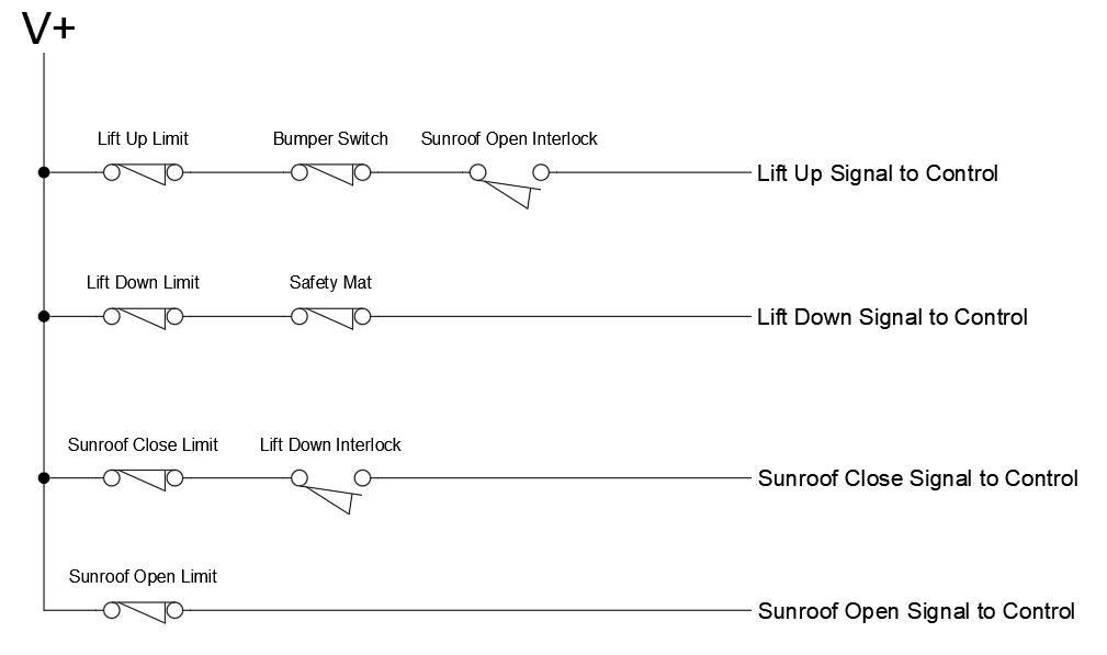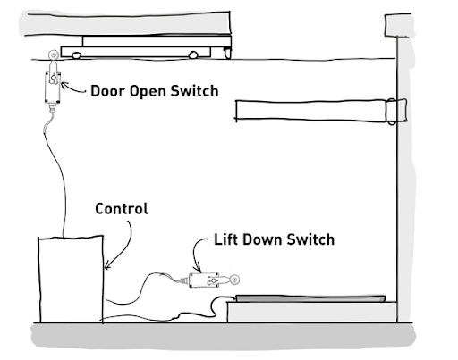 The Auxiliary Limits were originally conceived to be used with a Floorpocket and trapdoor (sunroof) application. This way, if you placed a Normally Open limit switch that is connected to the FWD Aux Limit input of the Stagehand Pro AC in the open position of your trapdoor (sunroof), this would prevent the lift from moving forward (or up) until the trapdoor (sunroof) is open. Similarly, you can do this with the REV Aux Limit to prevent the trap door from closing while the lift is in its raised position by placing a Normally Open limit switch where the limit is struck when the lift reaches its lowest position and is clear of the trapdoor (sunroof). If you are not using a trapdoor (sunroof) with your Floorpocket, you do not need Auxiliary Limits for your system. If you are not using a trapdoor (sunroof) with your Floorpocket, simply insert the included auxiliary limit jumpers to clear the limits. The graphic below shows how the limits could be placed for this system.