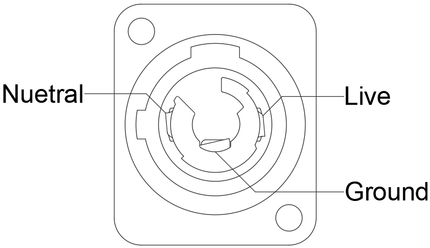The power inlet of the Spotline Mini is a Neutrik blue powerCON 20A Inlet (NAC3MPA-1-WOT). The mating connection is a Neutrik blue powerCON 20A NAC3FCA included connector. Attention: The powerCON is a connector without breaking capacity, i.e. the powerCON should not be connected or disconnected under load or live conditions. We included just the connector to offer the flexibility of use regardless of what 220v socket your venue has installed. See below for wiring details inside the connector.