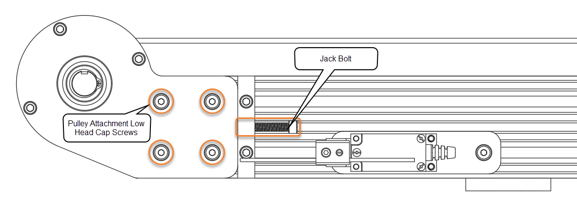 4. Tighten the ¼”-20 x 2-¼” Jack Bolt with a 3/16” hex key until the belt has approximately 1/64” of deflection per inch of belt.