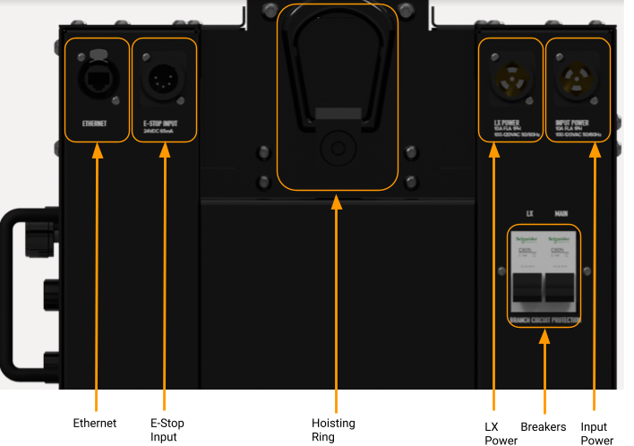 The Spotline Practical is a smart machine, meaning the Stagehand controller is on board. You need to provide three connections to make the hoist run, and a fourth to provide power to your lighting fixture. Prior to making any power connections ensure the two breakers on the front of the Practical are in the off position.