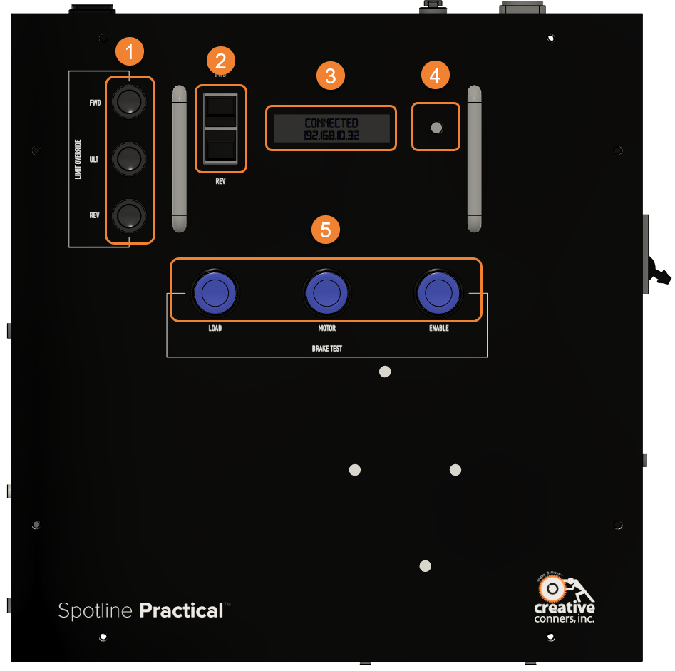 Momentary Limit Override buttons - When pressed, the onboard Stagehand will temporarily override the FWD, REV, or ULT limits. This feature is intended to be used when manually jogging the Spotline Practical.