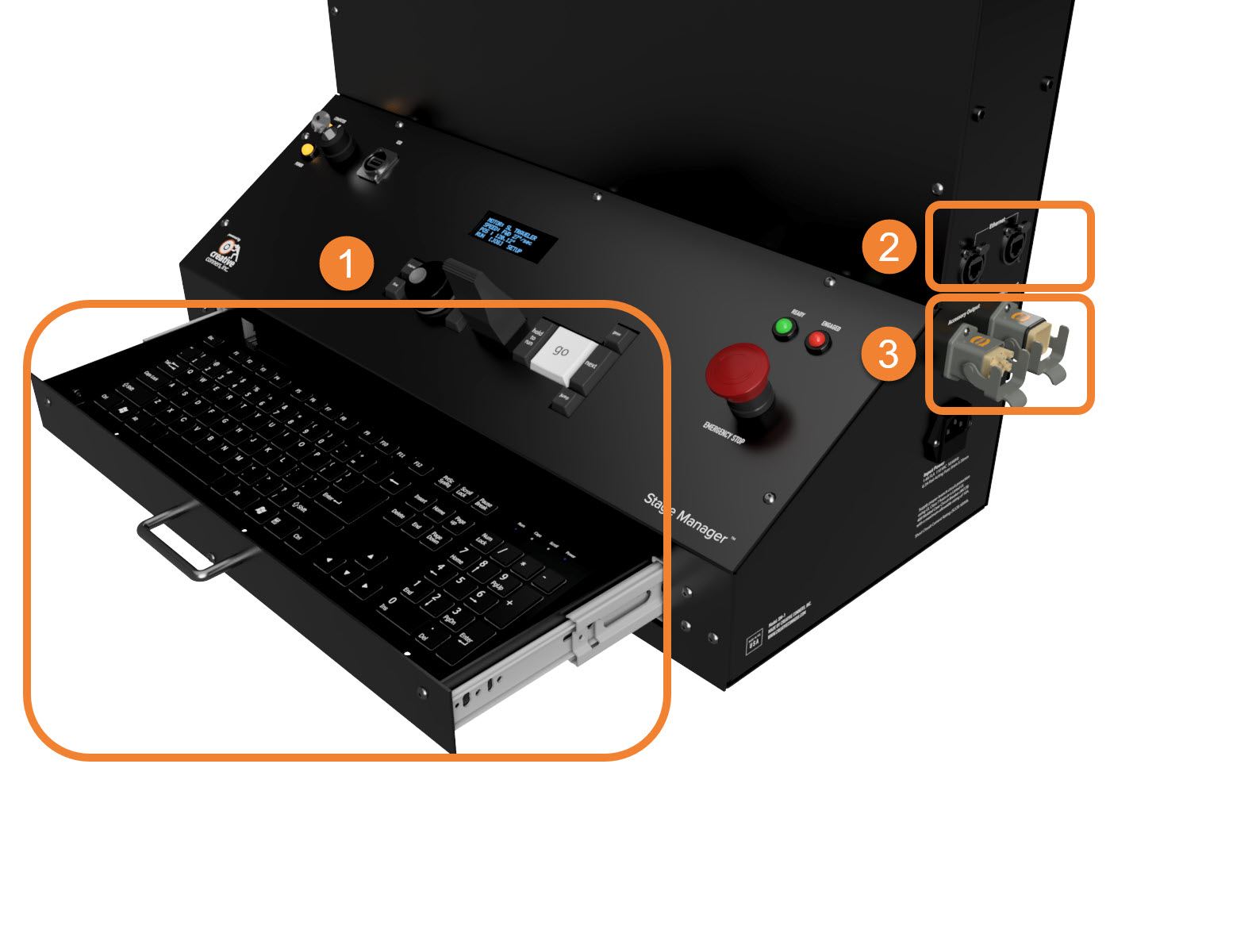 2. Key-Locked Power Switch and Indicator Lights - Two indicator lights show when the Stage Manager is connected to power, and if the industrial computer is turned on. The keyed power switch is the first line of defense to deter unauthorized access to the automation controls.