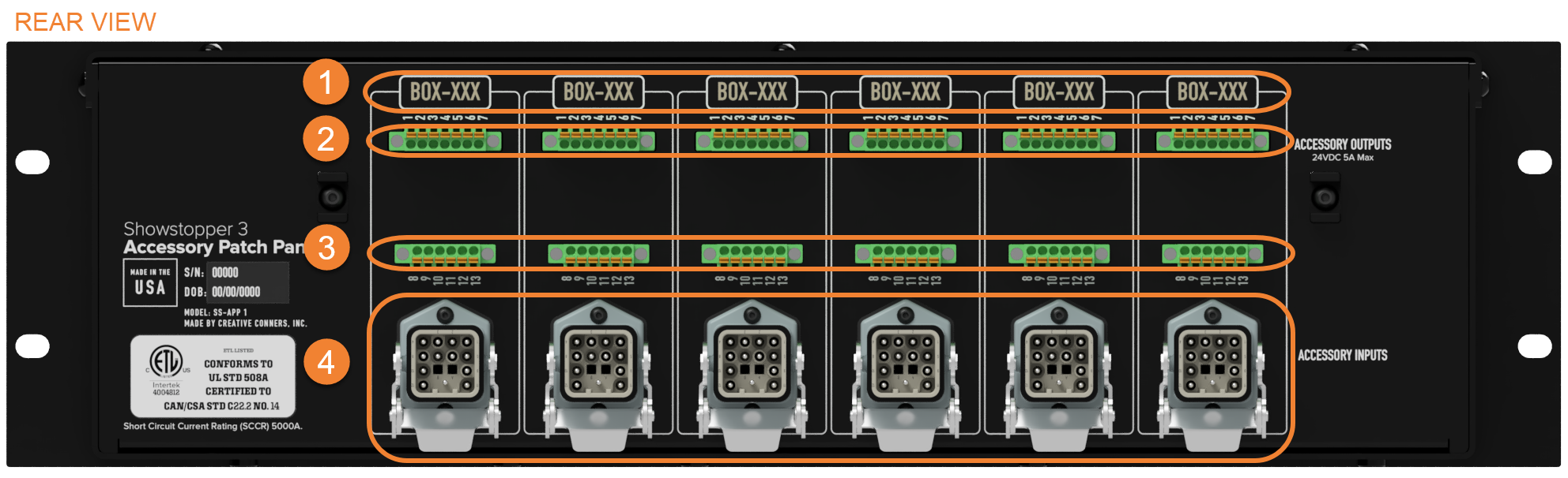 4. Accessory Input - 6 accessory input for connecting to the outputs of your Showstopper 3 Accessory Hub or Showstopper 3 Base.