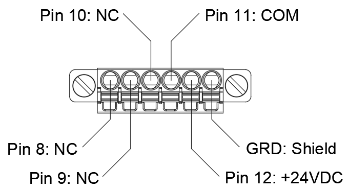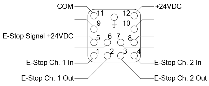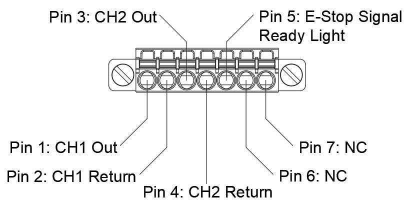 The Accessory output passes through power (+24VDC) to the accessory devices as well as Remote E-Stop capability. These connections are standard Female Phoenix Terminal Blocks. There are two sets of contacts: Pins 1-7 are wired into a 7P 5A Female Mini Combicon Header Phoenix Contacts: