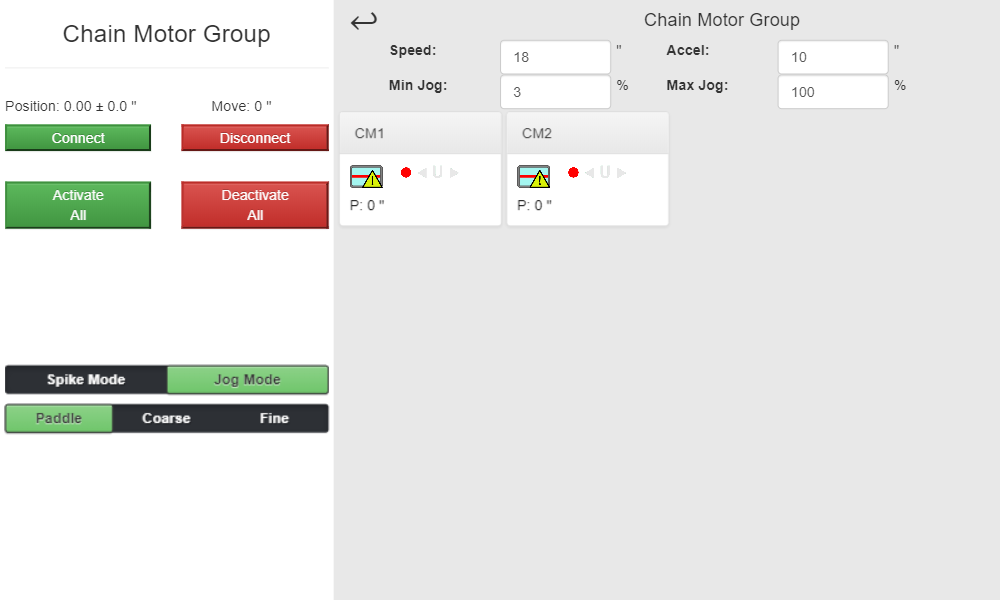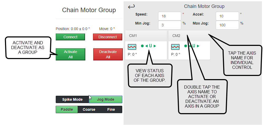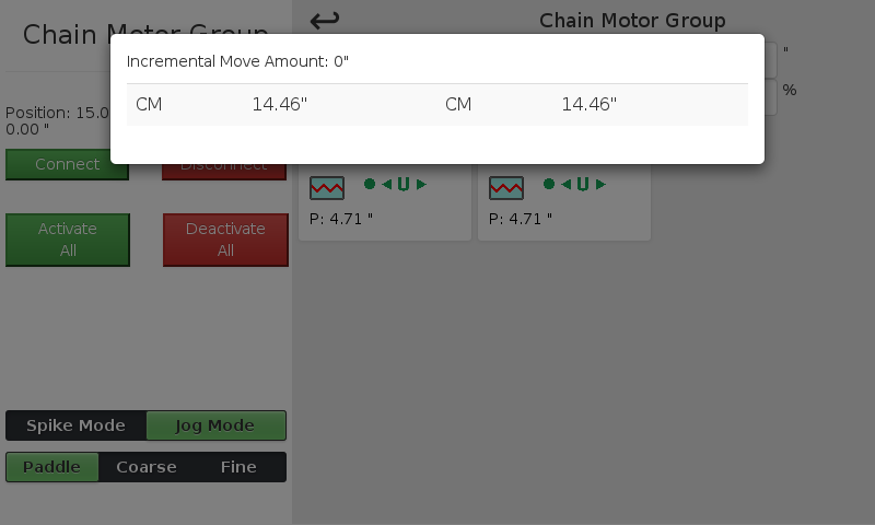 If you need to jog an individual motor in a group you can do that as well. Click on the group to drill down into the group to show all the single axes in that group. Once the group is open, move and jog the with the paddle or wheel just like a single axis. However, different from the single axis jog, the group jog will display a different screen showing the current position for each axis within the group.