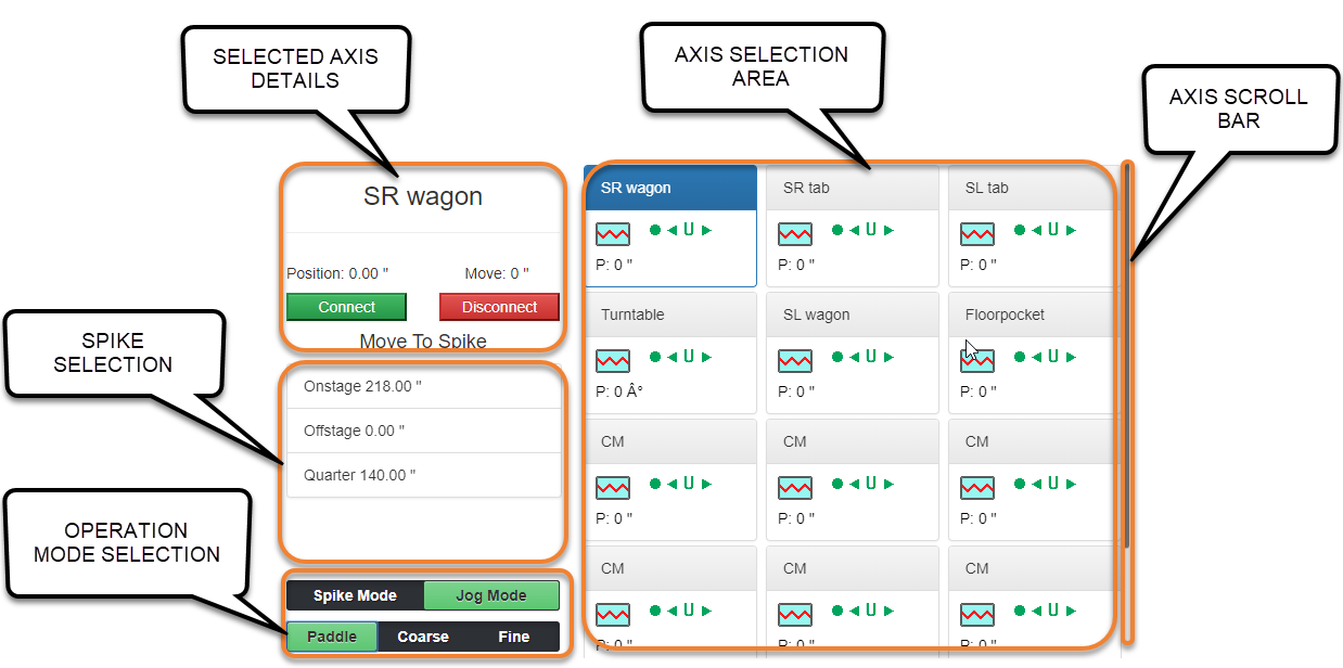 The Axis Selection area will be populated with any Stagehands or Motion Groups in your show file. If your show only has one axis, you will only see one motor displayed. If you are working with more than 12 axes or 12 groups, you can scroll down with the scroll bar or slide the axes up to see additional units.