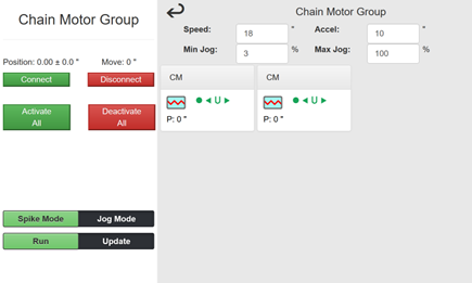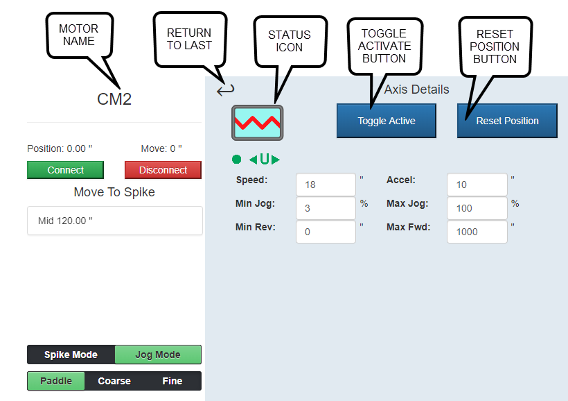 To access the Axis Detail Screen, double tap on the name of the axis you want to see more information about. In the Axis Detail Screen, you can activate or deactivate your motor, reset the position, and change speed, acceleration, and position values. You can also run your motors in Spike Mode or Jog Mode from the Axis Detail Screen.
