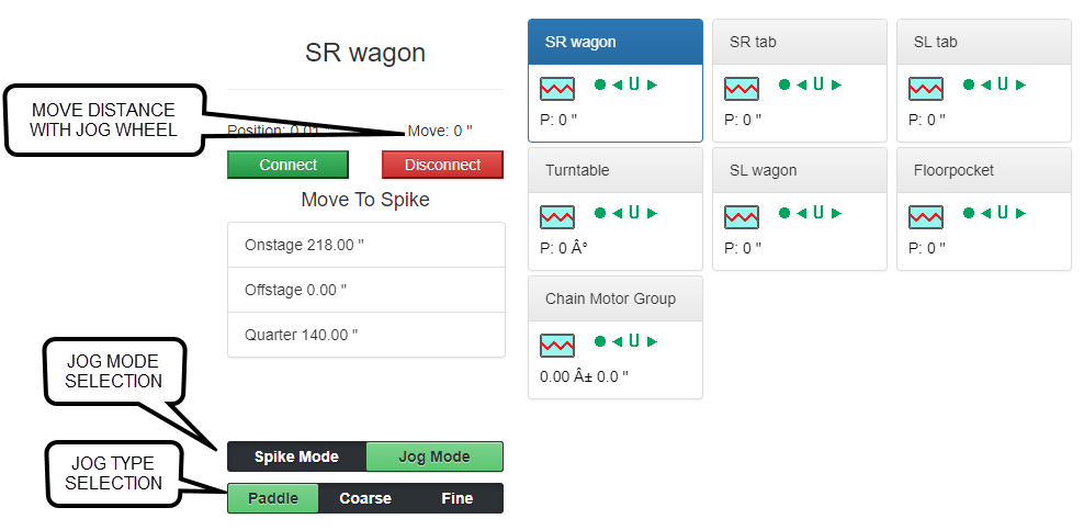 Jogging with the Paddle is the quickest way to move the selected axis or group. The Paddle offers proportional control of the selected axis - the further you move the paddle the faster the axis will go. This is really helpful when moving scenery on stage for spacing and placement. As with the Showstopper 3 Consolette and the Spikemark on-screen jog slider, the Paddle has a non-linear jog profile, making jog movements smooth through the full range of motion. Here’s how to jog with the paddle: