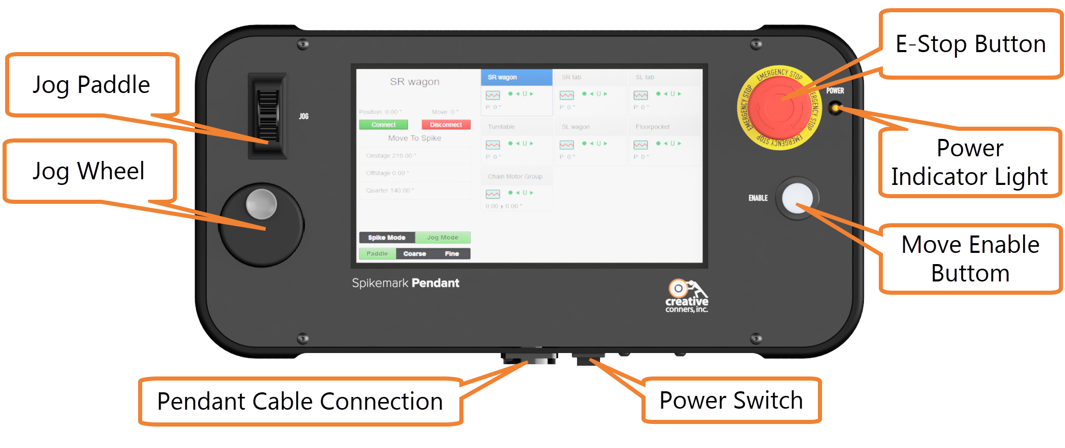 Once the Pendant and Spikemark are communicating you are ready to go. Before you Make It Move! let's take a look at the Pendant buttons, levers and knobs: