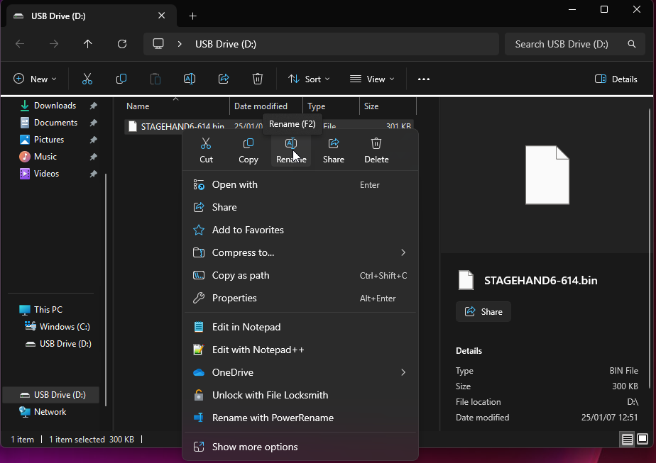 7. Right Click on the new file in the microSD Card, and select Rename file. Change the name to "update.bin" **in all lowercase** and press Enter to confirm.