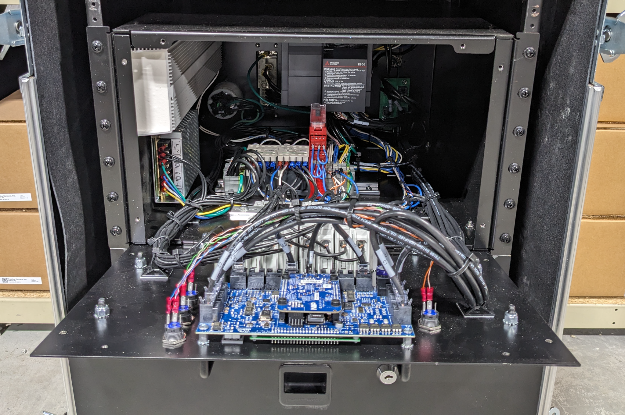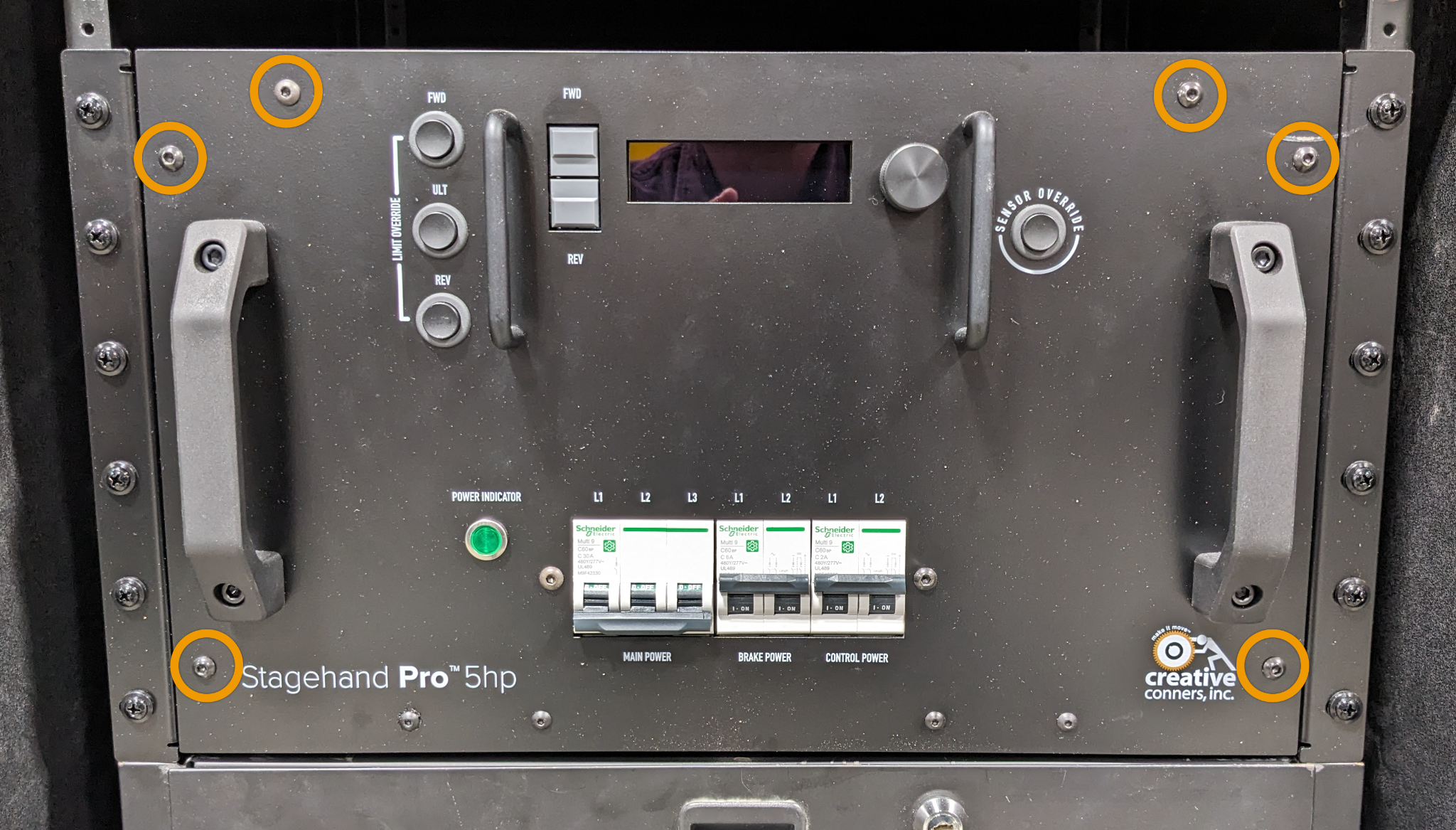 1. Remove the 6 button head cap screws holding the front panel and gently tip the front panel down to reveal the Stagehand Control Card.\