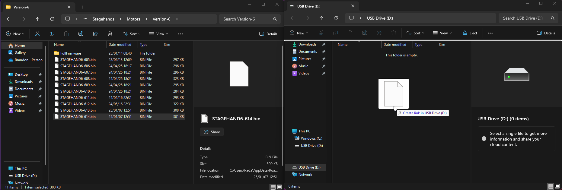 5. Open a 2nd File Explorer window and navigate to the Spikemark firmware directory: C:\Users{User}\AppData\Roaming\Spikemark\Firmware\Stagehands\Motors\Version-6