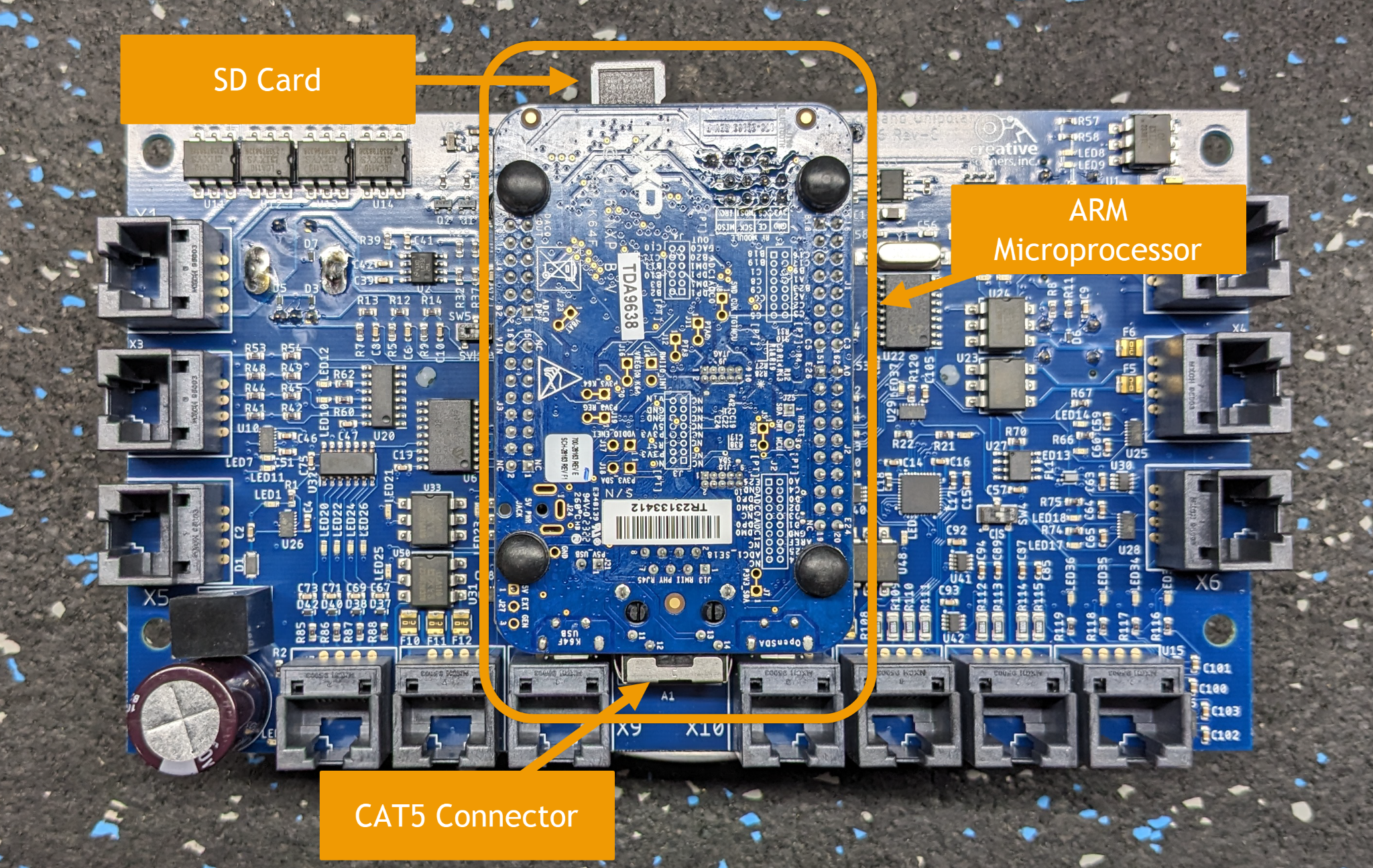 2. In the center of the Control Card is a smaller card that has a micro SD card at the top and a single CAT5 at the bottom. This is the ARM microprocessor.\\