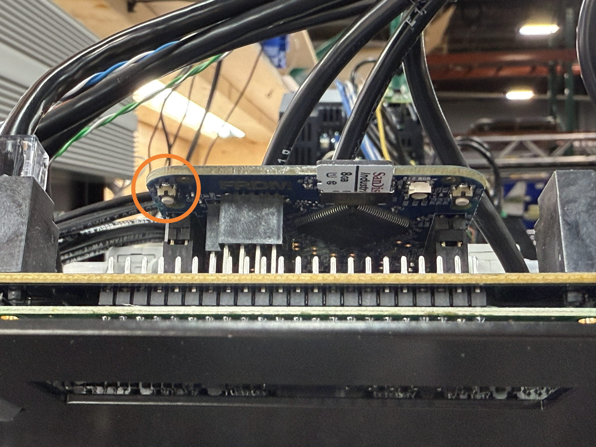 10. Once the Stagehand card is powered on, press the small button on the underside of the board that is to the left of the microSD Card. This will start the firmware update process.
