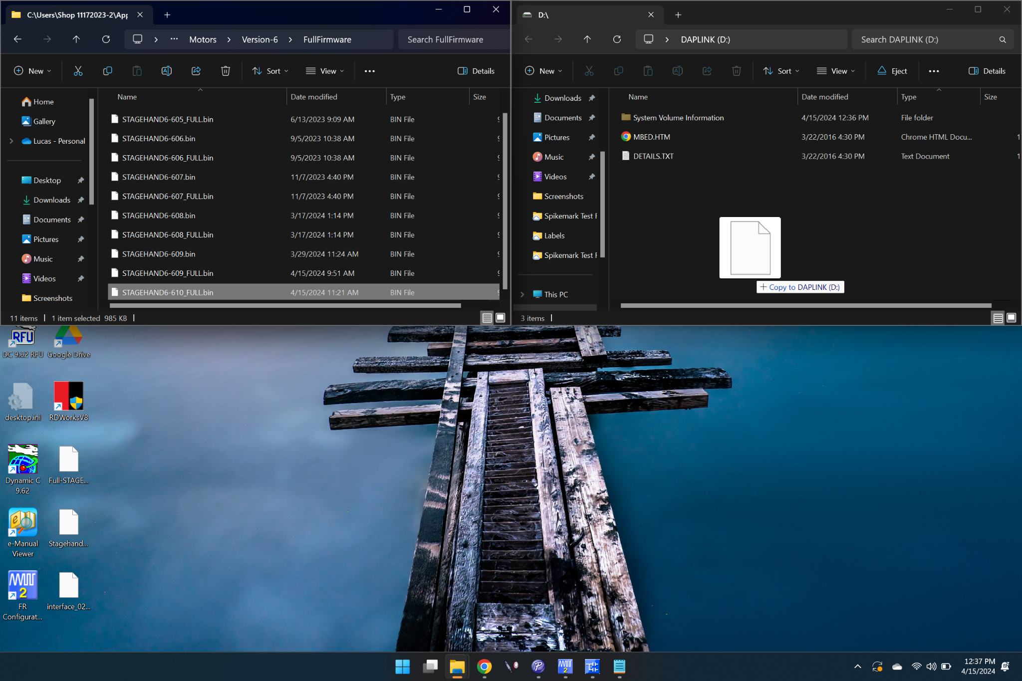 Open a 2nd File Explorer window and navigate to the Spikemark firmware directory: C:\Users\{User}\AppData\Roaming\Spikemark\Firmware\Stagehands\Motors\Version-6\FullFirmware PRO TIP: You may need to “Show Hidden Files” to see all the information.\