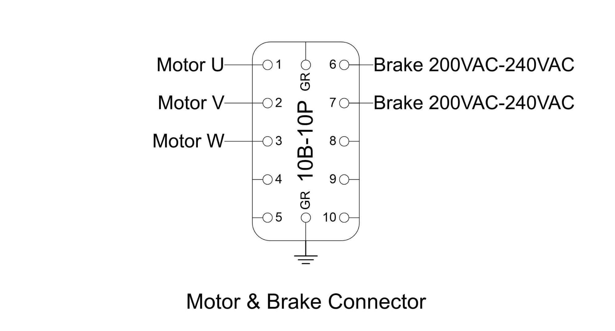 Power output connections for a motor and spring-set, fail-safe brake have been combined into a single connector. The connector is a 10-pin rectangular receptacle (Automation Direct Part #ZP-MC10B-1-FS010). The pin-out is shown below: