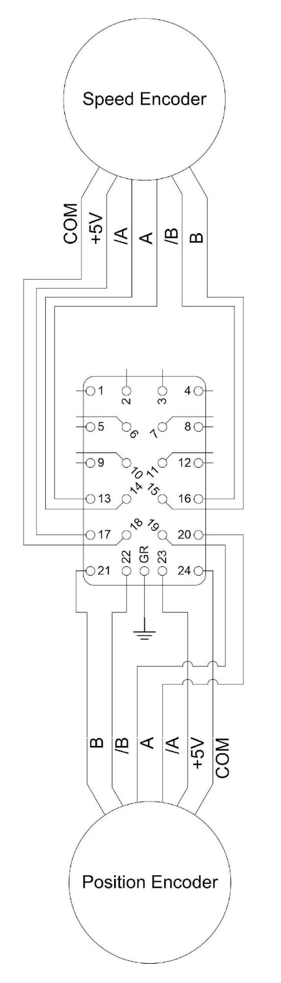 Two sets of encoder signals (one for speed monitoring and one for positioning) and three sets of limit switches (forward, reverse, and ultimate) are combined in one rectangular connector (ILME CDDF-24).