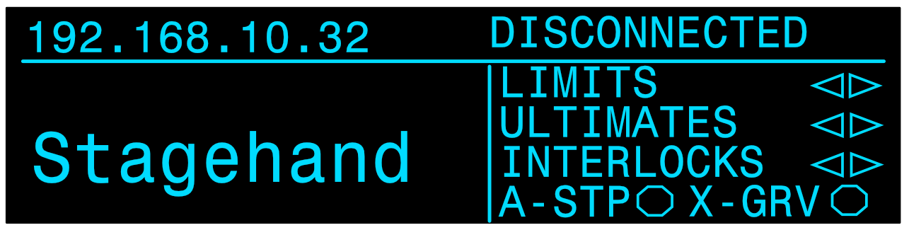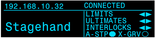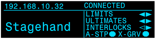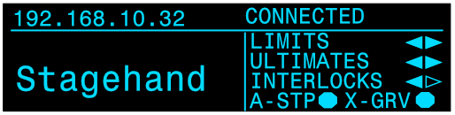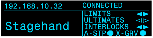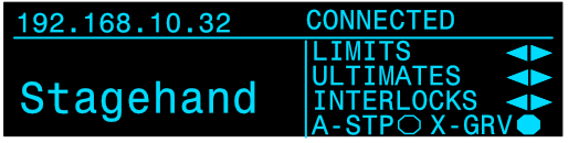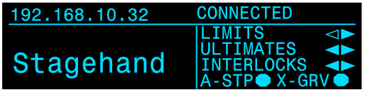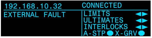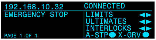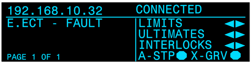 <table data-header-hidden data-full-width="true"><thead><tr><th></th><th></th><th></th></tr></thead><tbody><tr><td><img src="https://3040525219-files.gitbook.io/~/files/v0/b/gitbook-x-prod.appspot.com/o/spaces%2F-MhFI6SSKpm8M7EkrYqp%2Fuploads%2Fgit-blob-b406457ec57b7c4b53ca00d1111777e942c38170%2FReverse%20Limit%20Indicator%402x.png?alt=media" alt="" data-size="original"></td><td><img src="https://3040525219-files.gitbook.io/~/files/v0/b/gitbook-x-prod.appspot.com/o/spaces%2F-MhFI6SSKpm8M7EkrYqp%2Fuploads%2Fgit-blob-e4f56c7972b4db9514e0d79505d60a4db504b274%2FForward%20Limit%20Indicator%402x.png?alt=media" alt="" data-size="original"></td><td><img src="https://3040525219-files.gitbook.io/~/files/v0/b/gitbook-x-prod.appspot.com/o/spaces%2F-MhFI6SSKpm8M7EkrYqp%2Fuploads%2Fgit-blob-9c16bea71c01f8115b9700f18a2acff14828a401%2FUltimate%20Limit%20Indicator%402x.png?alt=media" alt="" data-size="original"></td></tr><tr><td>Reverse Limit</td><td>Forward Limit</td><td>Ultimate Limit</td></tr><tr><td><img src="https://3040525219-files.gitbook.io/~/files/v0/b/gitbook-x-prod.appspot.com/o/spaces%2F-MhFI6SSKpm8M7EkrYqp%2Fuploads%2Fgit-blob-ff0385ef5397ed2188499f4807f6d2b8b98d463e%2FDisconnected%20-%20No%20limit%20indicators%405x.png?alt=media" alt="" data-size="original"></td><td><img src="https://3040525219-files.gitbook.io/~/files/v0/b/gitbook-x-prod.appspot.com/o/spaces%2F-MhFI6SSKpm8M7EkrYqp%2Fuploads%2Fgit-blob-da83e17e6c8e2bd490de5de78809a1bb83326034%2FDrive%20Fault%20-%20E.ECT%20Fault%402x.png?alt=media" alt="" data-size="original"></td><td><img src="https://3040525219-files.gitbook.io/~/files/v0/b/gitbook-x-prod.appspot.com/o/spaces%2F-MhFI6SSKpm8M7EkrYqp%2Fuploads%2Fgit-blob-bbcfadc5f0eb296681e937d98d03435ce3c78bb7%2FConnected%20-%20E-Stop%402x.png?alt=media" alt="" data-size="original"></td></tr><tr><td>Disconnected, signal &#x26; interlock not connected</td><td>Drive Fault</td><td>E-Stop Engaged</td></tr><tr><td><img src="https://3040525219-files.gitbook.io/~/files/v0/b/gitbook-x-prod.appspot.com/o/spaces%2F-MhFI6SSKpm8M7EkrYqp%2Fuploads%2Fgit-blob-691e08b11c420a8f1f3f4f6dc94256838c66667a%2FAll%20Stop%20Indicator%402x.png?alt=media" alt="" data-size="original"></td><td><img src="https://3040525219-files.gitbook.io/~/files/v0/b/gitbook-x-prod.appspot.com/o/spaces%2F-MhFI6SSKpm8M7EkrYqp%2Fuploads%2Fgit-blob-cc5298c654976d85658f5a273df984c8600b8056%2FReverse%20Interlock%20Indicator%402x.png?alt=media" alt="" data-size="original"></td><td></td></tr><tr><td>All-Stop Interlock</td><td>Reverse Interlock</td><td>Forward Interlock</td></tr><tr><td><img src="https://3040525219-files.gitbook.io/~/files/v0/b/gitbook-x-prod.appspot.com/o/spaces%2F-MhFI6SSKpm8M7EkrYqp%2Fuploads%2Fgit-blob-17fa77d368deb734bcfc7d4921e36f57c2af02fc%2FCross%20Grooved%20Indicator%402x.png?alt=media" alt="" data-size="original"></td><td><img src="https://3040525219-files.gitbook.io/~/files/v0/b/gitbook-x-prod.appspot.com/o/spaces%2F-MhFI6SSKpm8M7EkrYqp%2Fuploads%2Fgit-blob-2d4b40c21793a405b3b336b8e6e05d04ea0ef89d%2FExternal%20Fault%402x.png?alt=media" alt="" data-size="original"></td><td></td></tr><tr><td>Cross Groove</td><td>External Fault</td><td></td></tr></tbody></table>