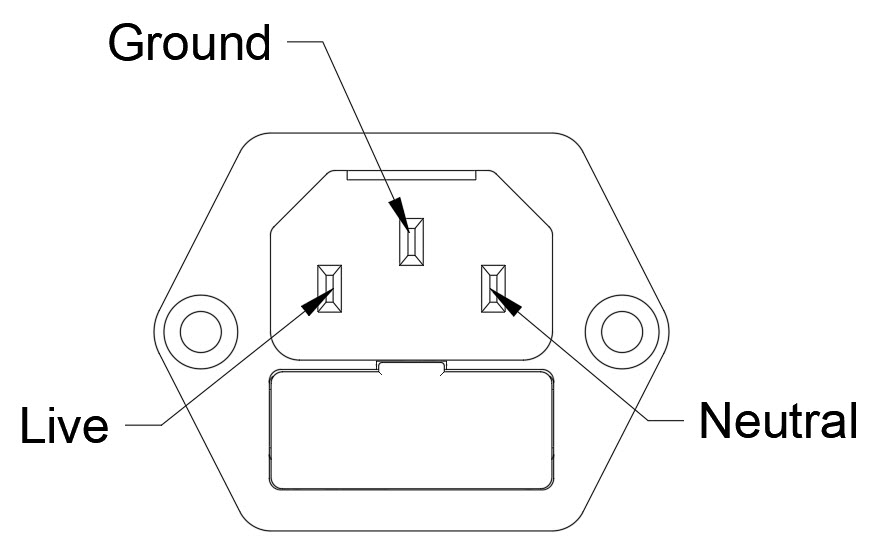 The Stagehand Apprentice DC requires a 120VAC Single Phase input power via the included Locking IEC Cable. Below the IEC connector is a built-in 5mm x 20mm fuse box, outfitted with a 5A Fast-Acting fuse.