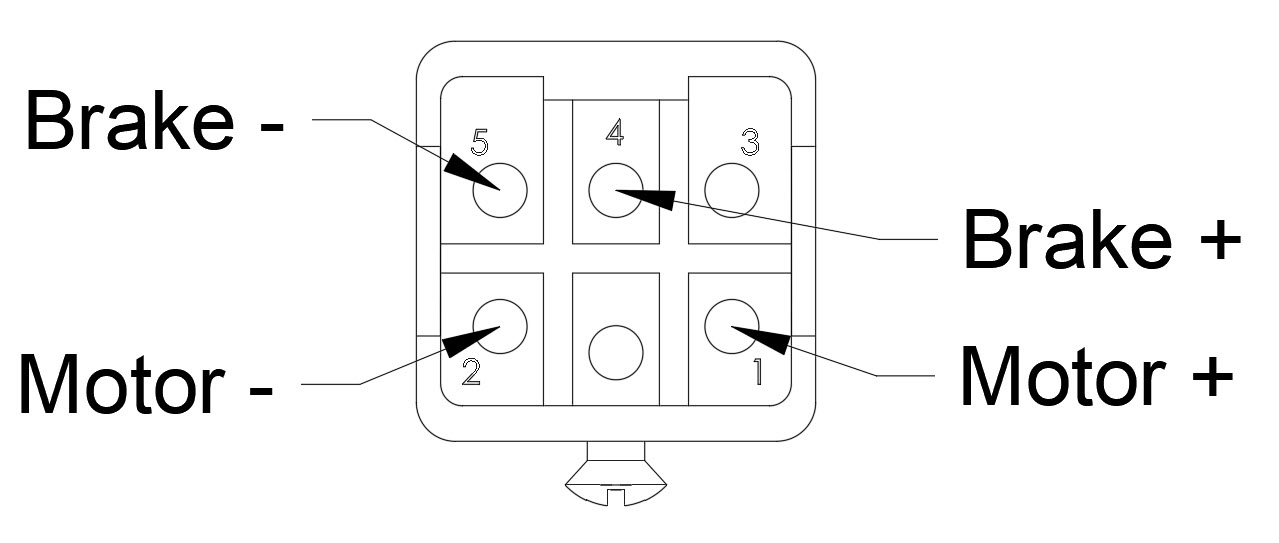 Power for a motor and brake is transmitted through a 5-pin + Ground rugged rectangular industrial locking connector.