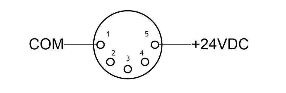 Power output for both the motor and brake have been combined into a single IRC - 21mm x 21mm (3A) 5P+G 600V/16A Female socket. The motor and brake connectors are available from several manufacturers and suppliers. Refer to the following diagram for details. The pins for their matching motor cables are Han E style, with the motor output connecting to pins 1 and 2 and the brake output connecting to pins 4 and 5. The Motor output will be 0-24VDC and the Brake output can control an electro-mechanical brake at 24VDC.