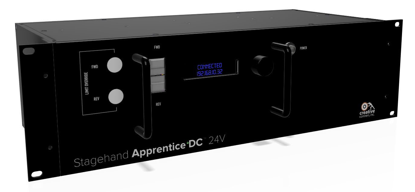 Congratulations on your purchase of the Stagehand Apprentice DC motion controller from Creative Conners, Inc. The Stagehand Apprentice DC brings the excitement of automation to theatres of all sizes. Combining the motion controller and motor drive into a compact package, The Stagehand Apprentice DC eliminates the clutter and complexity of other automation systems.