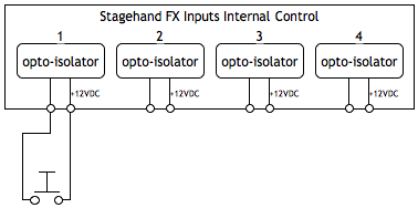 The Stagehand FX has four (4) inputs that can be used to detect a switch closure. By using normally open switch connected to a Stagehand FX input, you can trigger cue links and other actions in SpikeMark software when the switch is closed. The figure below shows a typical input connection.