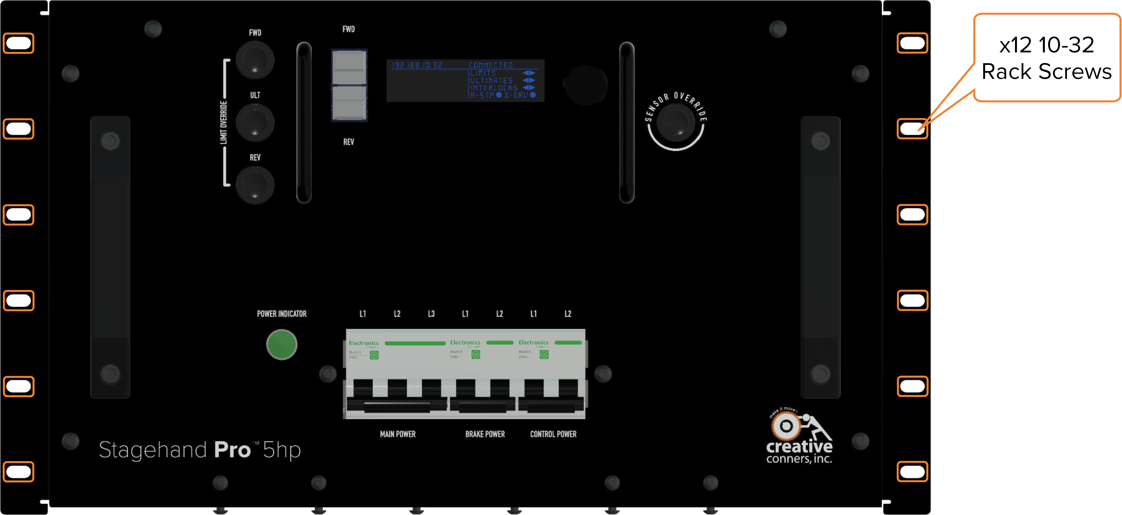 Install the Stagehand Pro 5 in any 19” equipment rack using up to qty: 12 10-32 Rack Screws.